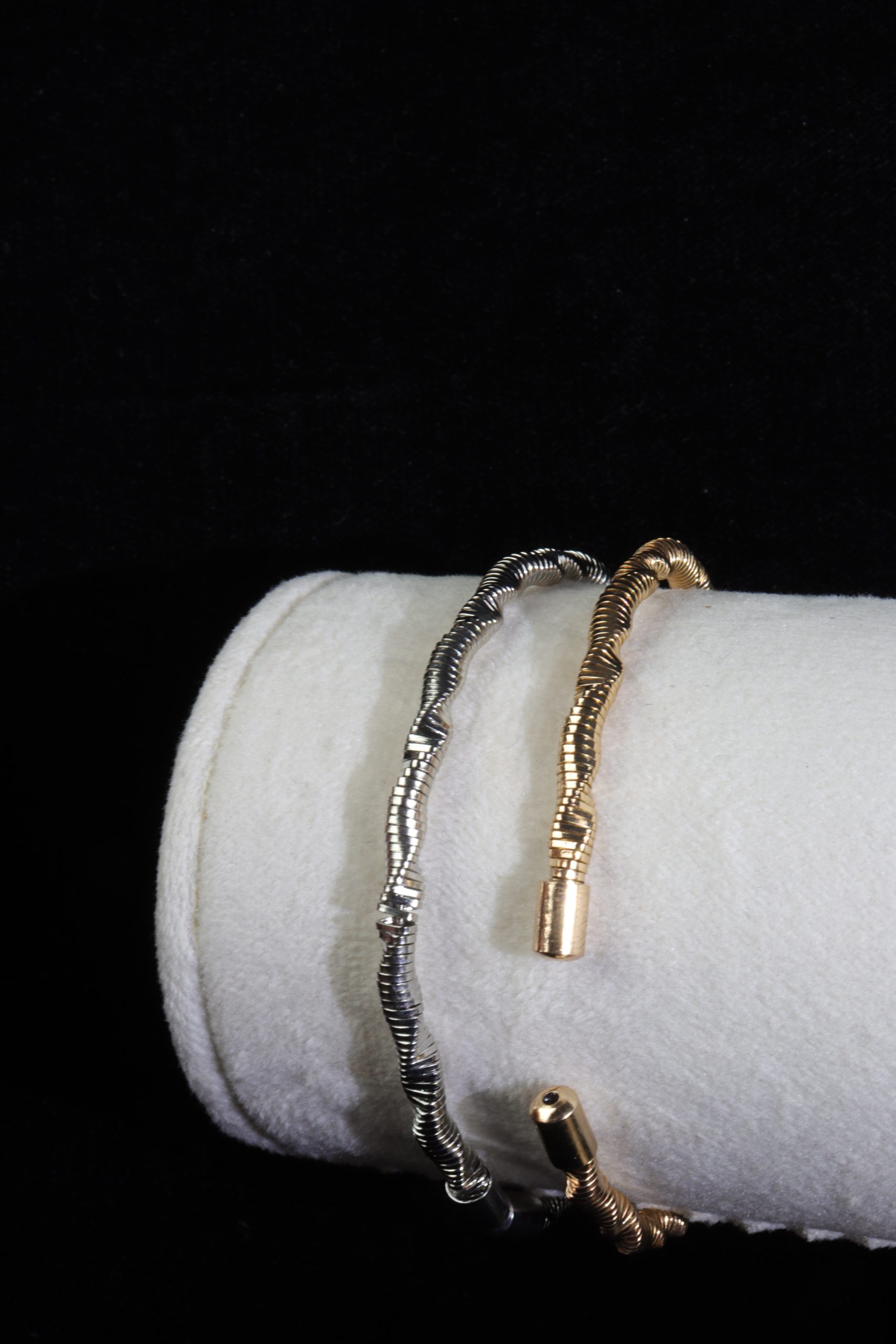 این ست شامل دو بنگل در رنگهای طلایی و نقرهای است که با ظرافت بالا و جزئیات دقیق ساخته شدهاند تا هم بهتنهایی و هم در کنار هم بدرخشند.